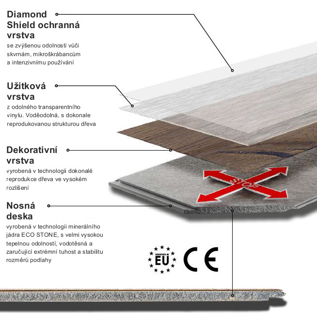 Základná doska: tuhé minerálne jadro Eco Stone s veľmi vysokou tepelnou odolnosťou, vodovzdorné