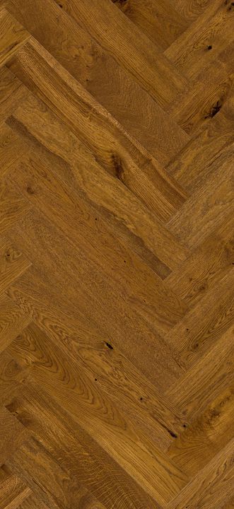 Podlahy Sugar Brown Herringbone Oak sú vyrábané v triede s vyšším počtom uzlov. Povrch je zdobený kefovaním, ktoré zdôrazňuje elegantný dojem tradičných dubových podláh. Povrch podlahy je jemne morený a chránený oxidačným olejom. Dosky sú zo všetkých strán skosené. Tento typ podlahy je možné inštalovať lepením na celú plochu.