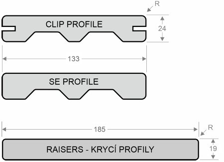 Profilovanie: klipový profil s bočnou drážkou na montáž klipov a profil SE na lemovanie a schody. Raisery na lemovanie