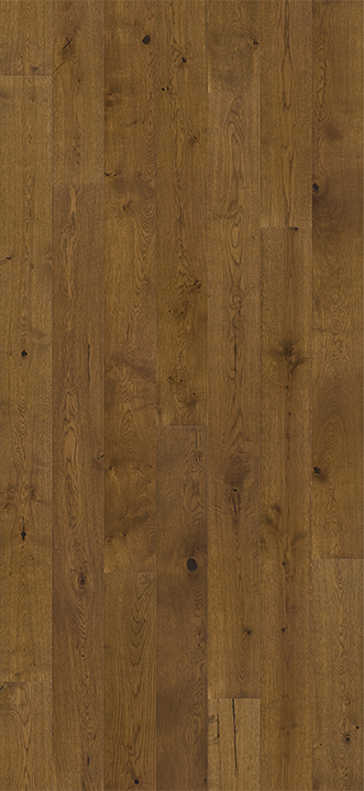 Trojvrstvová dubová podlaha Garda Medio v doskách s rozmermi 155 mm s veľkým množstvom uzlov. Hrany dosiek sú zo štyroch strán skosené. Povrch podlahy je namorený do dymovo hnedej farby, chránený matným lakom a zdôraznený kefovaním. Tento typ podlahy je vhodný pre podlahové kúrenie.