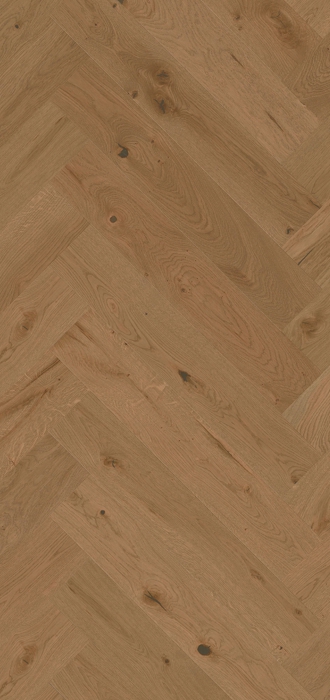 Podlahová doska Mainland Herringbone Oak je namorená v príjemnom hnedom odtieni a vyrobená v triede s vyšším počtom uzlov. Povrch je chránený matným lakom a zdobený kefovaním. Dosky sú zo všetkých strán skosené.