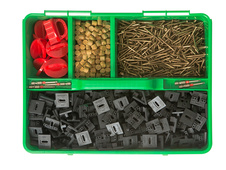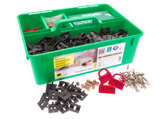 Súprava Pro – 450 spôn, 500 skrutiek, 5 vrtákov, 8 rozpieracích kolíkov, 50 drevených hmoždiniek z dreva Ipe, montážny návod.