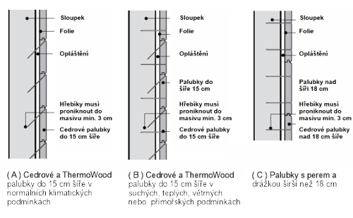 Podlahové dosky s perom a drážkou sa môžu inštalovať horizontálne alebo vertikálne. Pri horizontálnej inštalácii začnite od spodnej časti povrchu a postupujte smerom nahor, pričom drážkované hrany smerujú nadol. Obklady z cédru a ThermoWoodu so šírkou do 15 centimetrov je možné pripevniť skrytým spôsobom, aby hlavy klincov alebo skrutiek neboli viditeľné, ale obklady musia byť vždy pripevnené k nosnému stĺpiku. Klinec musí prechádzať cez každú drážku. Širšie obklady je možné pripevniť dvoma klincami na jeden kus. Spojovacie klince alebo skrutky musia preniknúť 3 cm do základného nosníka. Pri vertikálnej inštalácii obkladu začnite v jednom rohu tak, aby drážkovaný okraj smeroval k susednej stene. Pomocou vodováhy sa uistite, že prvá doska je umiestnená presne. Je možné, že drážkovaný okraj prvej dosky bude potrebné upraviť, aby sa zabezpečilo dokonalé prispôsobenie. Obklad sa pripevňuje k horizontálnym latám umiestneným medzi stĺpikmi alebo k latám pod omietkou. Rovnako ako pri horizontálnej inštalácii obkladu, jednotlivé kusy s šírkou do 15 centimetrov je možné upevniť tak, aby hlavy klincov neboli viditeľné, ale širšie obkladové dosky budú viditeľné. Pre obklad zo sibírskeho smrekovca sa odporúča viditeľné upevnenie skrutkami, ako je znázornené na obrázku „C“.