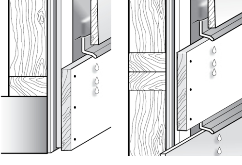 Rohové dosky a konce obkladu sú pripevnené klincami k rohovým stĺpikom, ktoré zabezpečujú drevo ako bezúdržbový spoj. Navrhovanie striech s presahujúcimi okapmi, ktoré chránia rohy pred poveternostnými vplyvmi, tiež pomáha vytvárať bezproblémové spoje. Na okraje rezov vždy naneste základný náter alebo moridlo. Rohové dosky môžu byť položené buď vedľa alebo nad obkladom, ako je znázornené na obrázkoch.