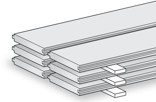 zelené Obklady vyrobené z nevysušeného alebo mokrého dreva, ktoré nebolo pred dodaním vysušené, vyžadujú dlhší čas na aklimatizáciu ako obklady vyrobené z vysušeného dreva. Jednotlivé časti oddeľte vertikálne umiestnenými rozpierkami tak, aby boli vždy dve časti vedľa seba, a skladujte ich v dobre vetranom, suchom prostredí najmenej 30 dní, alebo dlhšie vo vlhkom prostredí. Pri nákupe nevysušeného obkladu odporúčame profily, ako sú drážkované, skosené alebo lamelové, ktoré sú navrhnuté tak, aby vyschli. Odporúčajú sa aj užšie rozmery, pretože vo všeobecnosti fungujú menej ako širšie.
