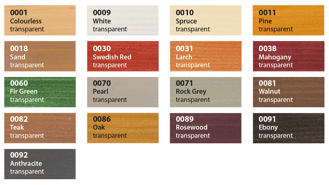 Exteriérové nátery Saicos olejová glazúra sú k dispozícii v mnohých transparentných odtieňoch s viditeľnou štruktúrou dreva pod náterom. Nižšie uvedené farebné tabuľky poskytujú prehľad dostupných odtieňov.