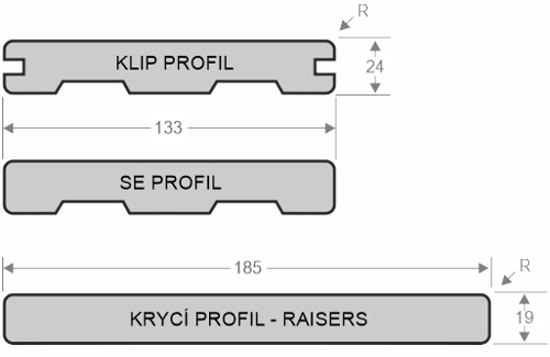 Formáty: Dosky 24x133x3660 mm a profily krycích podložiek 19x185x3660 mm
